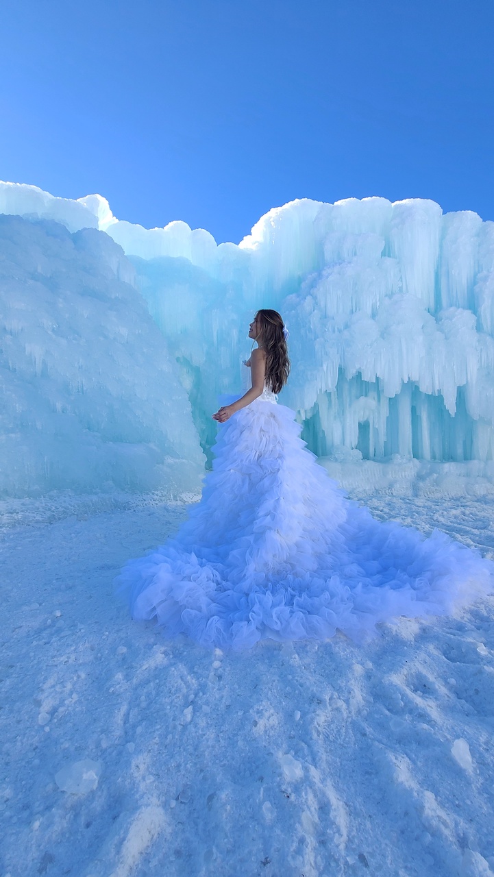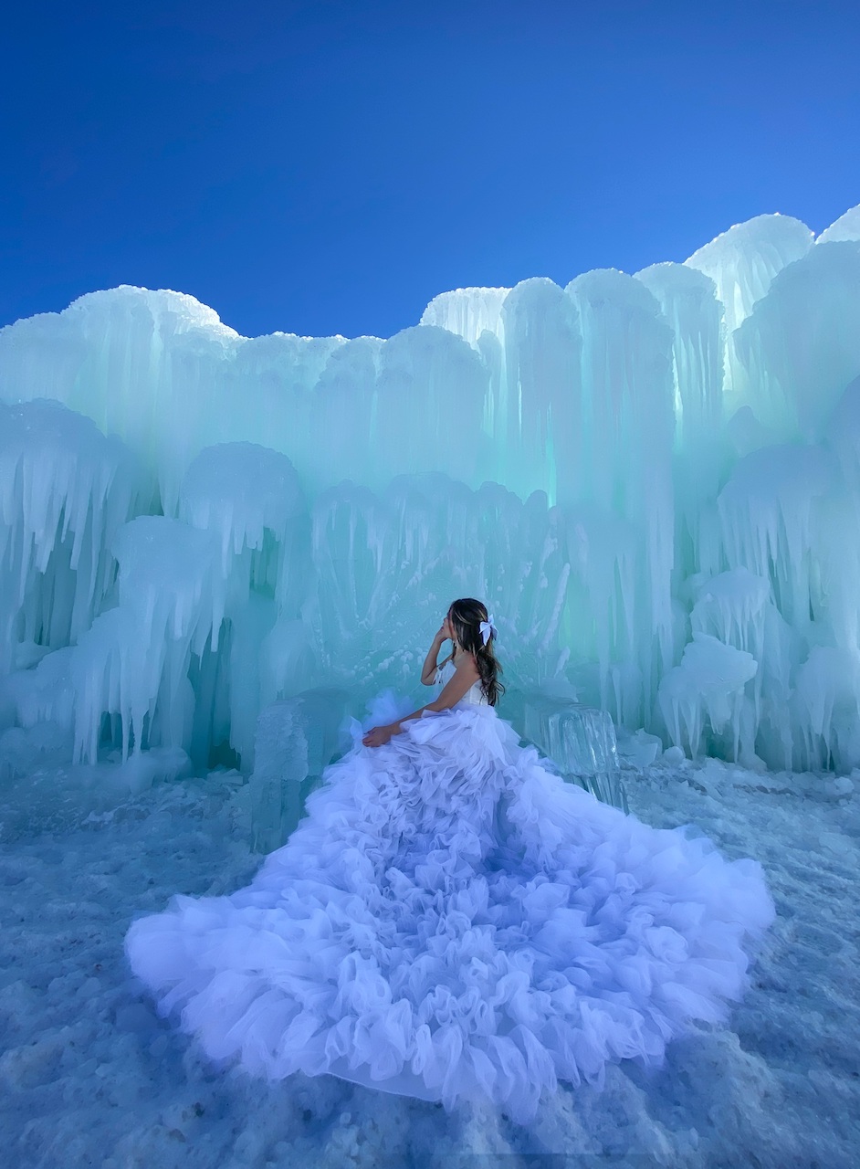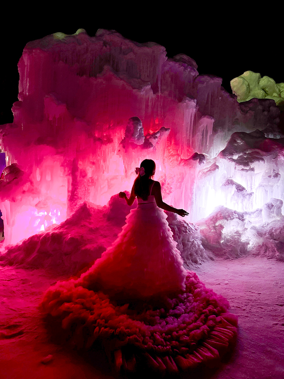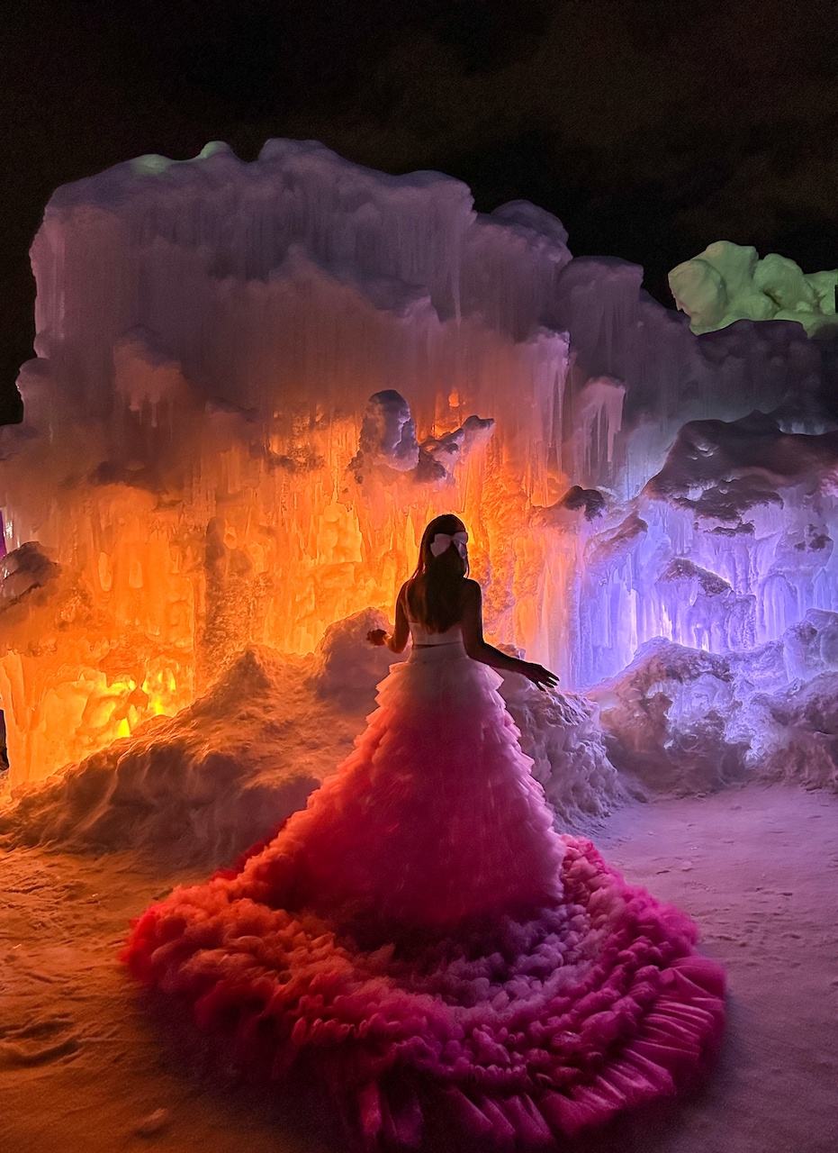 I had the pleasure of visiting ice castles in Midway, Utah, in 2022 and 2023, and enjoyed seeing its beauty in both day time and night time settings. With my handmade gowns, (link), I felt like a fairytale snow queen, come to life in this winter paradise. This magical place offers not only great photo opportunities but also an enjoyable experience for all ages. The castles include breathtaking LED-lit sculptures, slides, ice-carved tunnels, ice caverns, sleigh rides and much more.