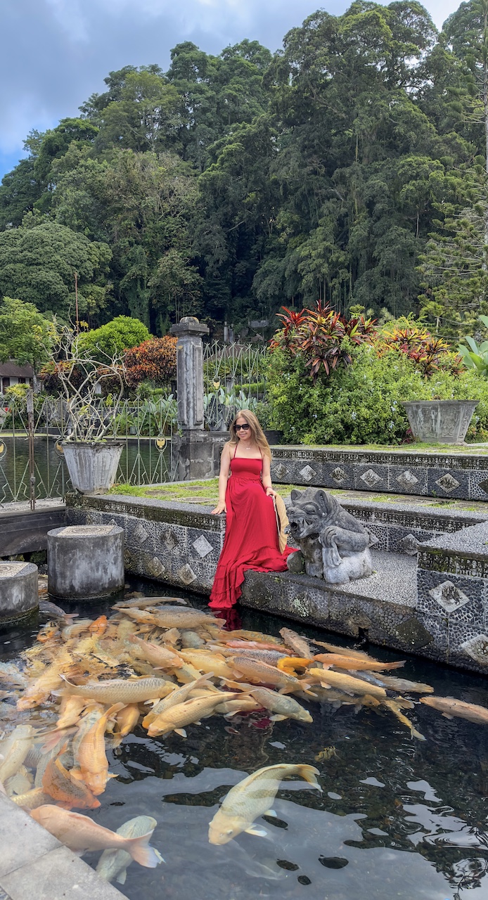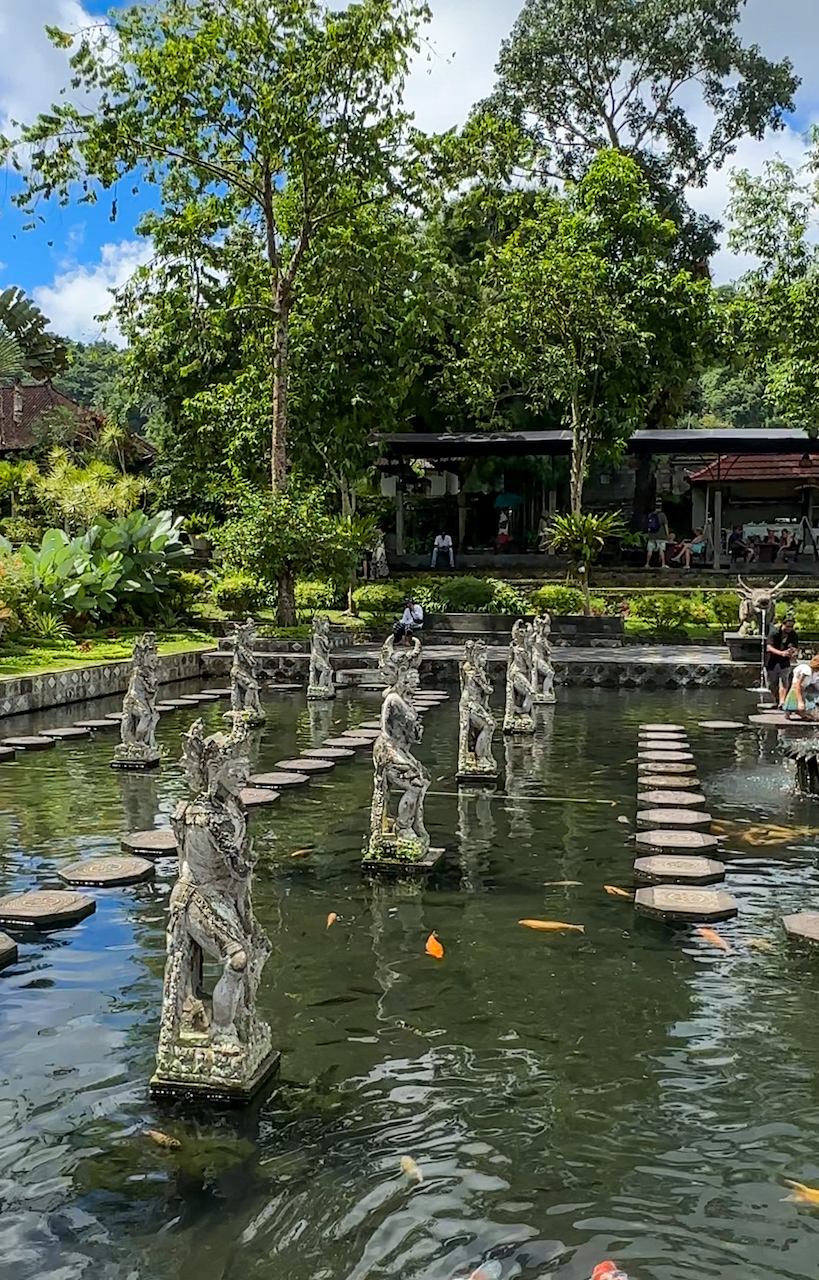 Since Tirta Gangga was just a short drive from Lempuyang Temple, our driver suggested we make a quick visit during our trip. Located in eastern Bali, Tirta Gangga is a former royal palace turned Hindu water temple. To enter the temple, there is a 70,000 IDR per person.. Here, you can enjoy the beautiful garden, stone sculptures, and feed the fish in the surrounding ponds. You can buy some fish food from the vendor near the garden, and the fish will be waiting for you. I was amazed by the abundance of koi fish at this temple, more than I’ve seen anywhere else in Bali. You can even take a boat ride for 20,000 IDR per person for one circle and enjoy feeding the fish while on the boat.